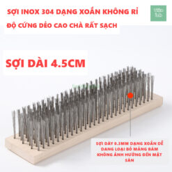 – Sợi inox 201 không rỉ, độ dày của sợi 0.35mm thiết kế dạng xoắn đa hướng giúp sợi chổi giảm thiểu khả năng bị cong vênh do lực chà đè xuống nền